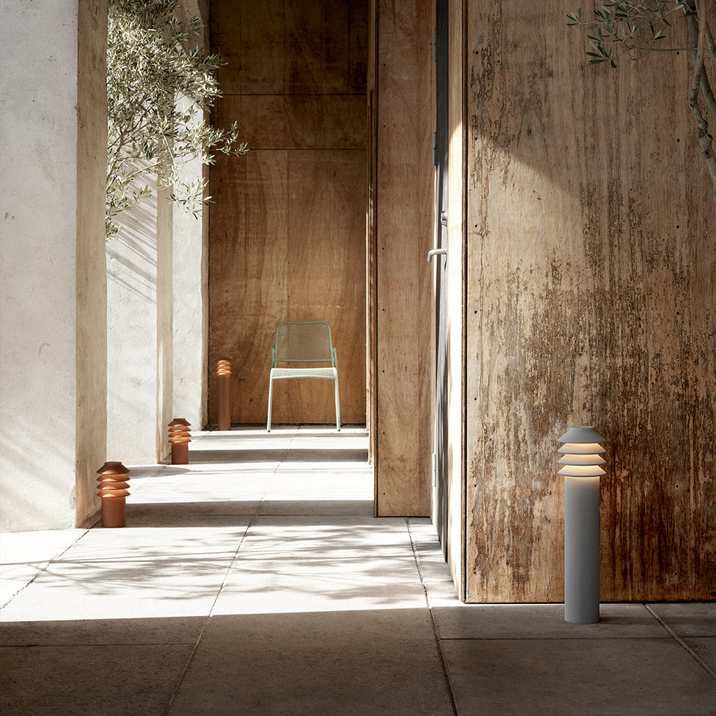 - De vandrette ringe fordeler lyset nedad og skaber et karakteristisk lysmønster, som både markerer gangarealer og giver en behagelig atmosfære i haven eller langs facaden.