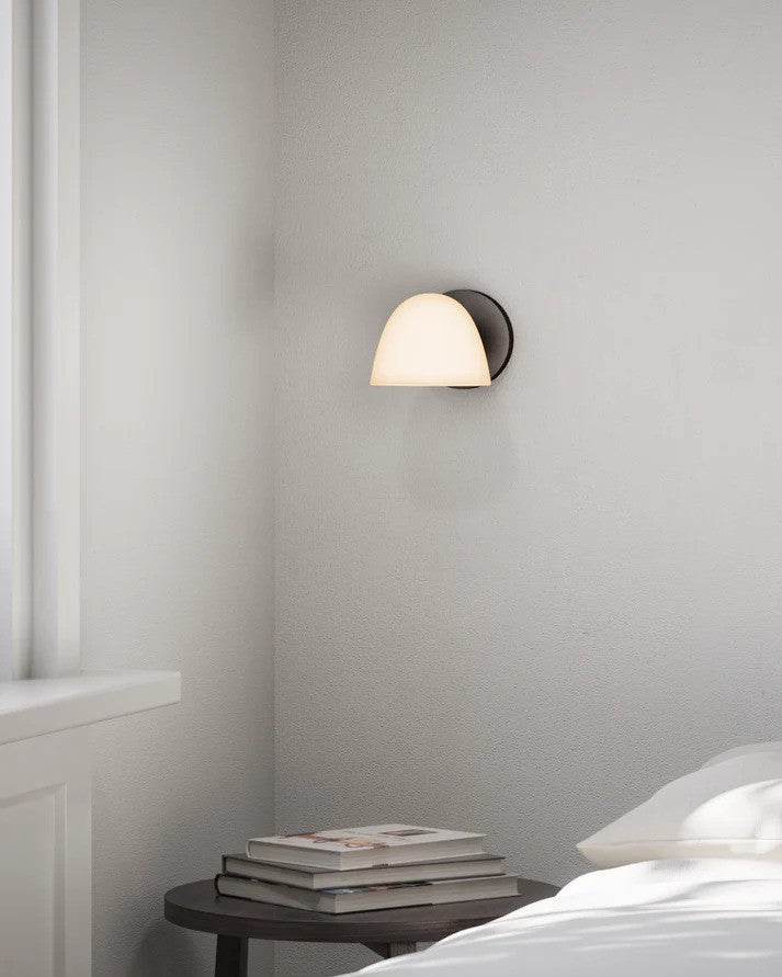 Stilrent dansk design til væg, opalglas og messing for atmosfærisk lys.