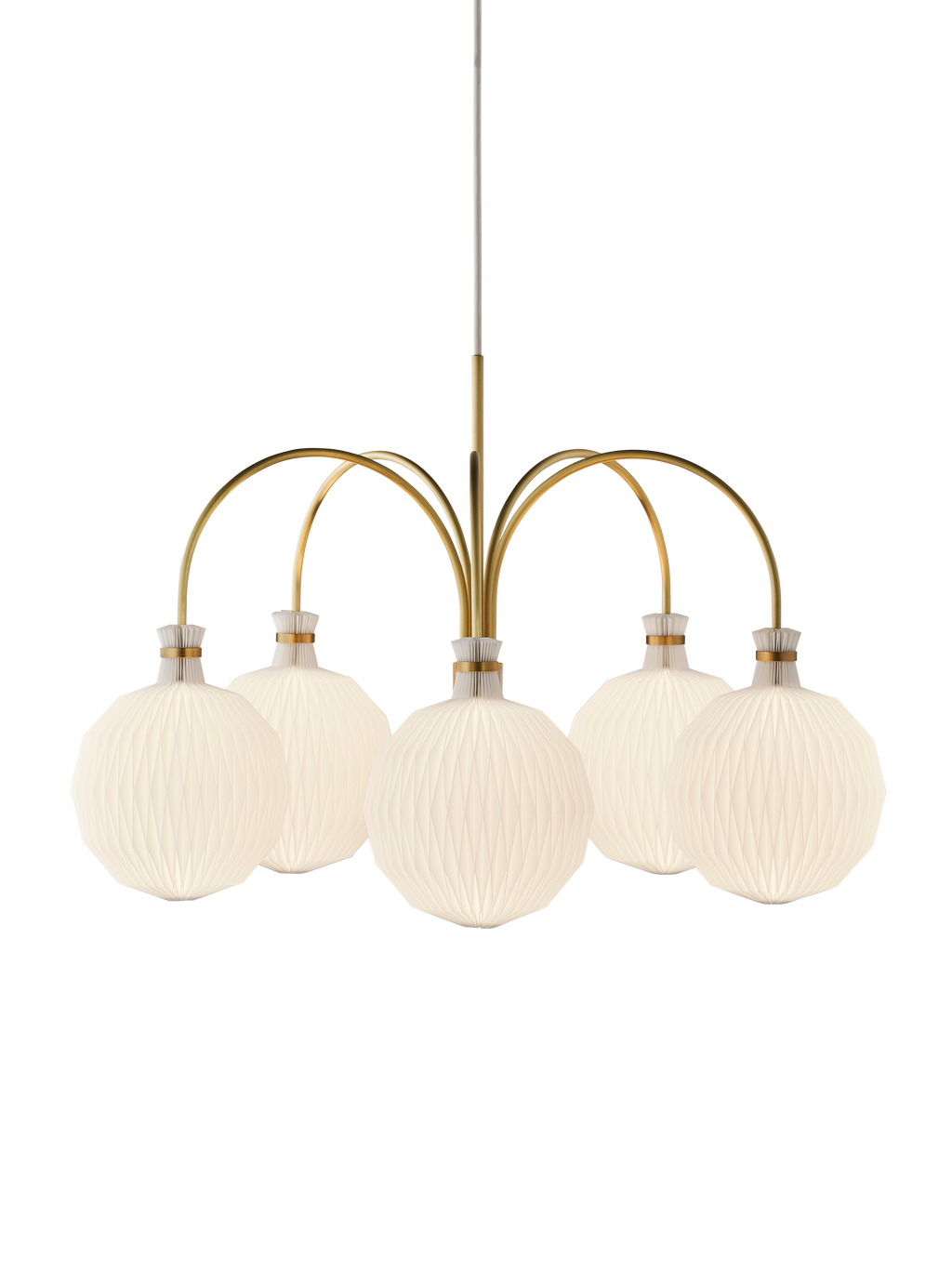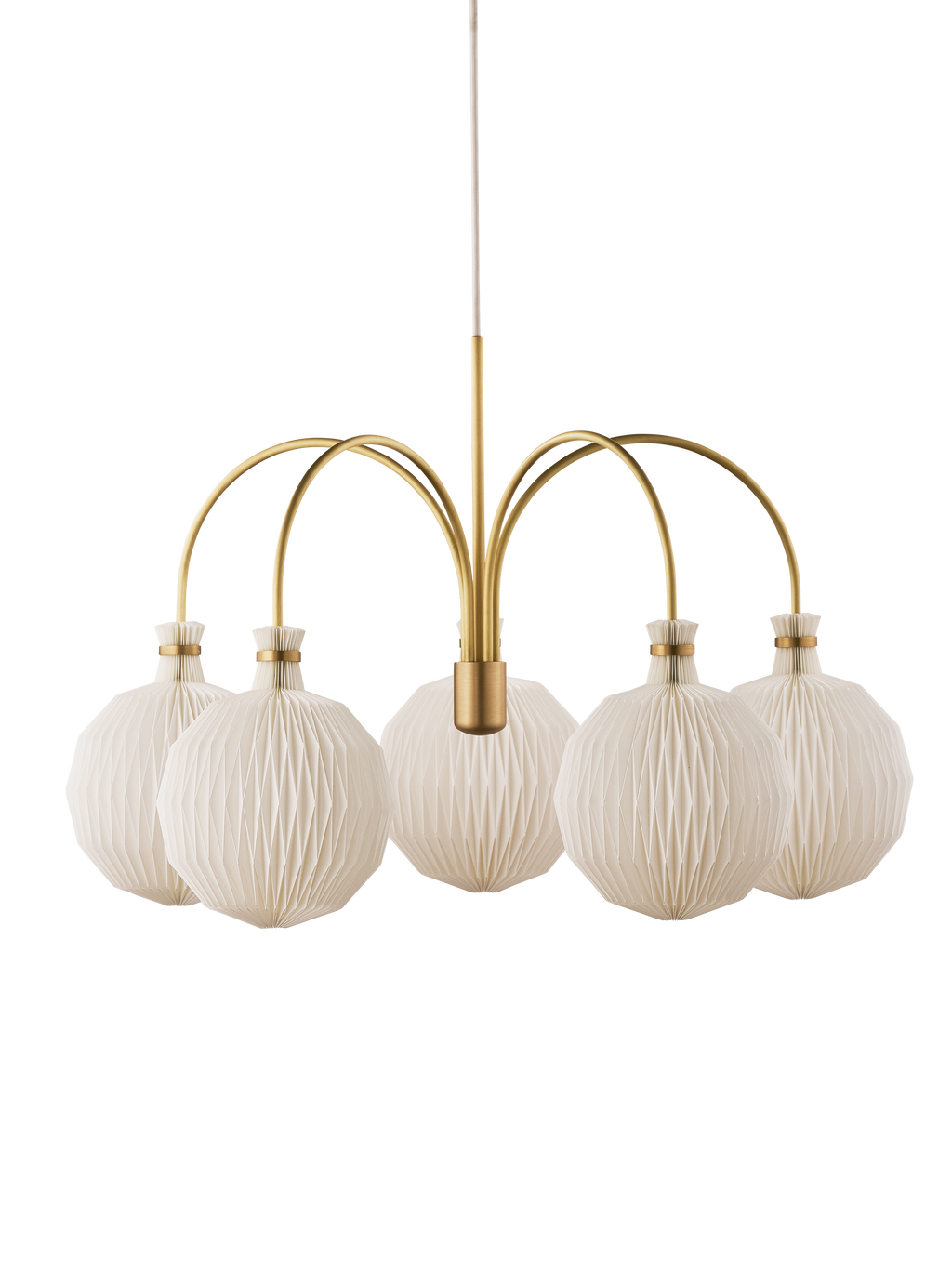Le Klint 101 Chandelier KAARE KLINT Legacy kombinerer klassisk dansk design med moderne funktionalitet og håndværk, hvilket gør den til et ikonisk valg for både æstetik og belysning. Med fem buede messingarme og håndfoldede skærme skaber denne lysekrone et harmonisk, blændfrit lys, der løfter ethvert rum og tilfører både varme og elegance.