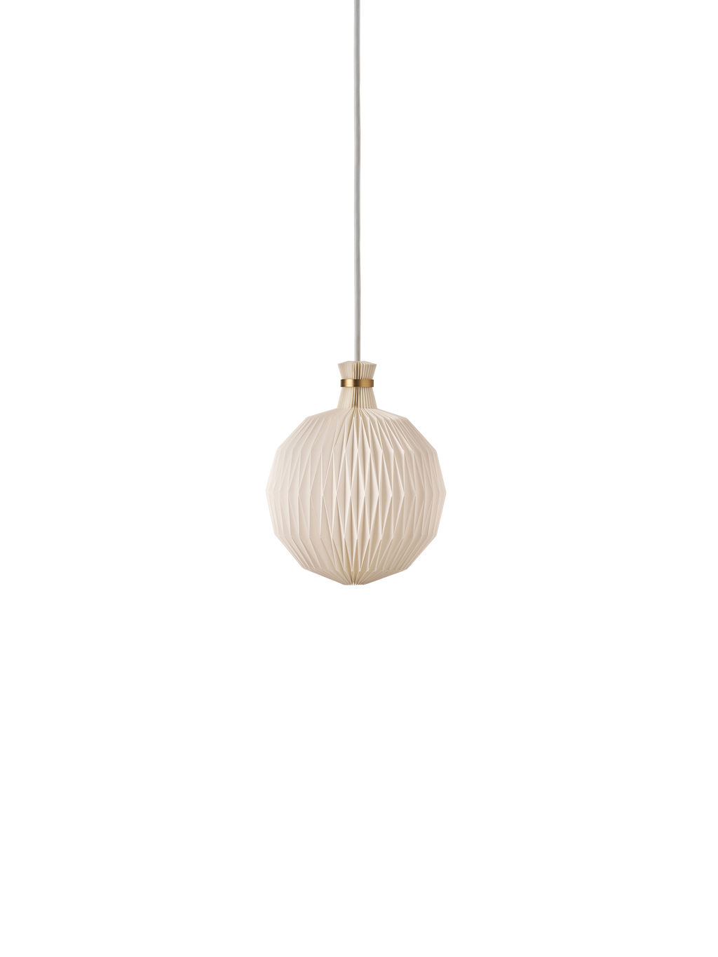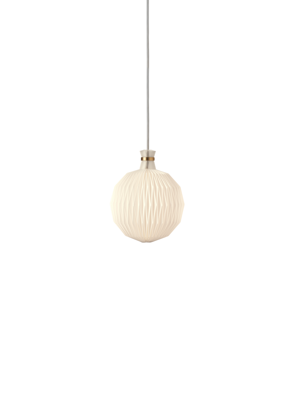 Materialet består af en let, men robust og håndfoldet plastskærm, der bærer Le Klint-signaturen i både funktion og tradition. Messingringen tilføjer en moderne kontrast, mens tekstilledningen styrker det samlede, eksklusive udtryk. Lampen bruger E14 fatning med maksimal 10W pære og måler 17 cm i diameter og 24 cm i højde, hvilket gør den velegnet til pladsbesparende indretning.