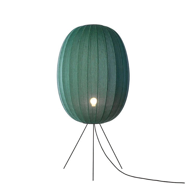 Knit-Wit Ø65 High Oval Floor Medium i Tweed Green er en unik gulvlampe, der kombinerer traditionelt håndværk med moderne design. Lampen er håndstrikket med en avanceret strikketeknik, som ikke kan laves på maskine, hvilket giver hver lampe et smukt og levende lys, der skinner igennem det brandhæmmede garn.