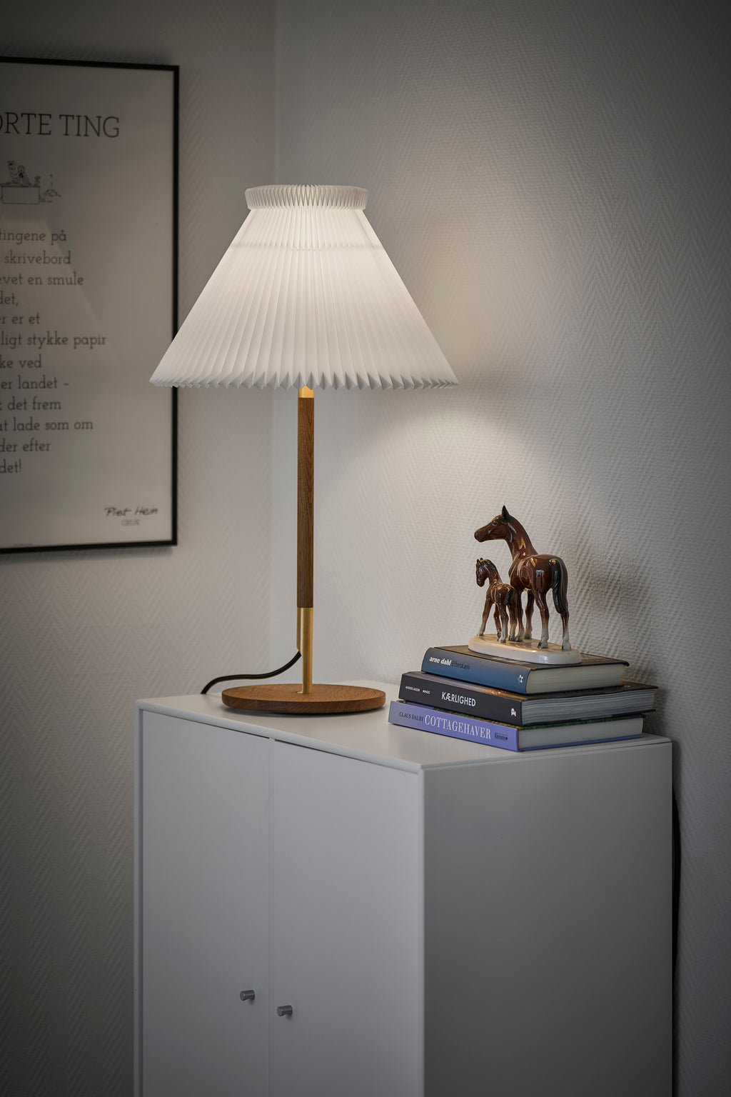 Denne bordlampe er oplagt til dig, der værdsætter skandinavisk design, naturlige materialer og en rolig, varm atmosfære i hjemmet. Den passer perfekt ind i en moderne, nordisk indretning med træ, tekstiler og dæmpede farver, hvor den kan bruges som læselampe i stuen, som funktionel bordlampe på hjemmekontoret eller som elegant natbordslampe i soveværelset. Kombinationen af blødt, blændfrit lys og den markante, plisserede skærm gør den til et naturligt fokuspunkt, uden at den tager opmærksomheden fra resten af indretningen.