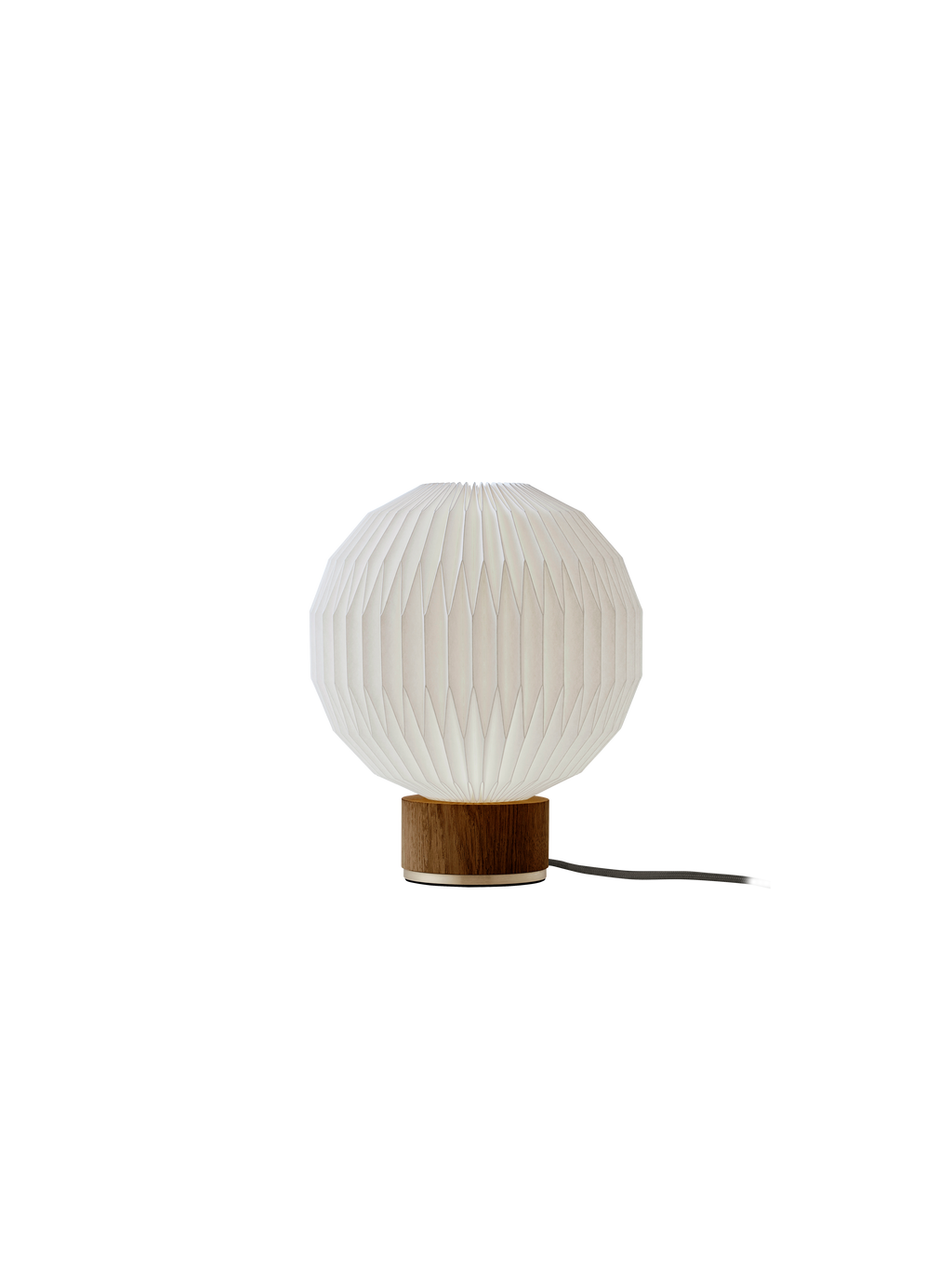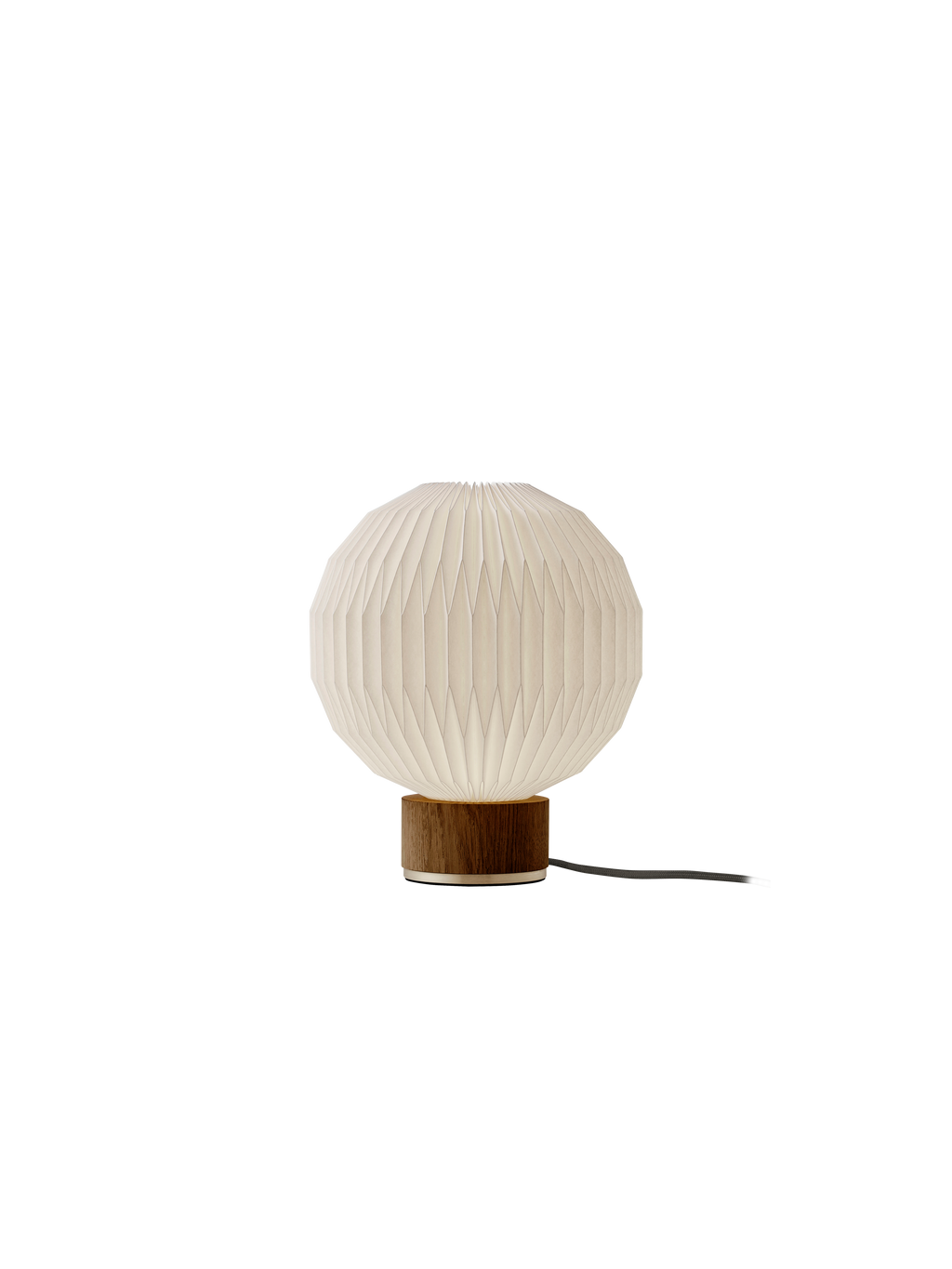 Elegant bordlampeserie med tidløst dansk design, håndfoldet skærm og eksklusiv træfod