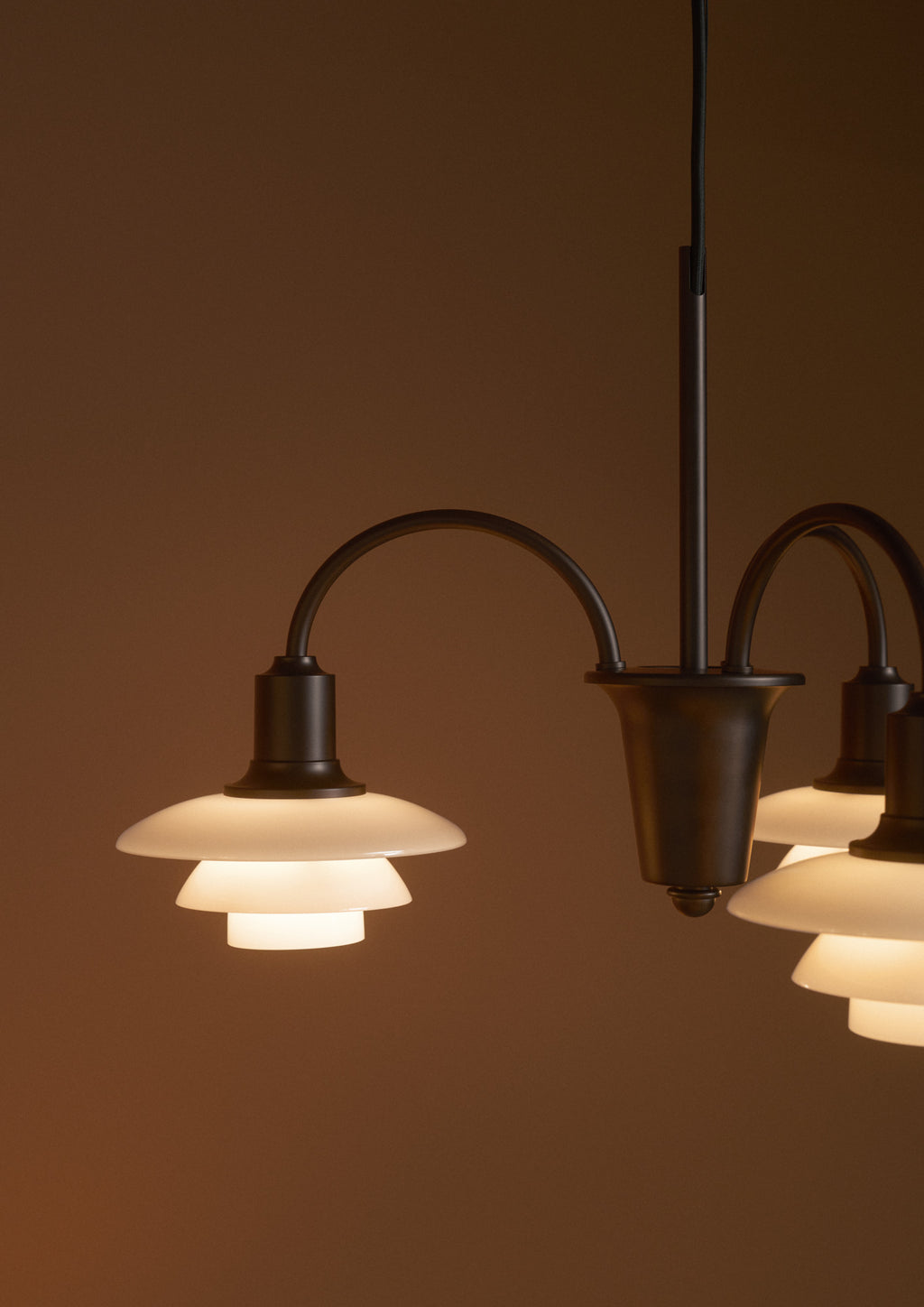 Poul Henningsen lysekrone i bruneret messing og glasskærme