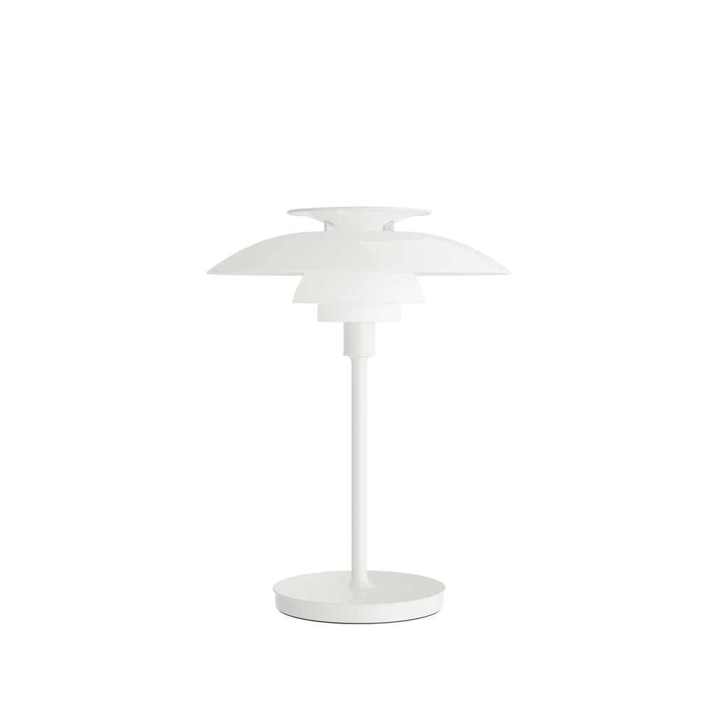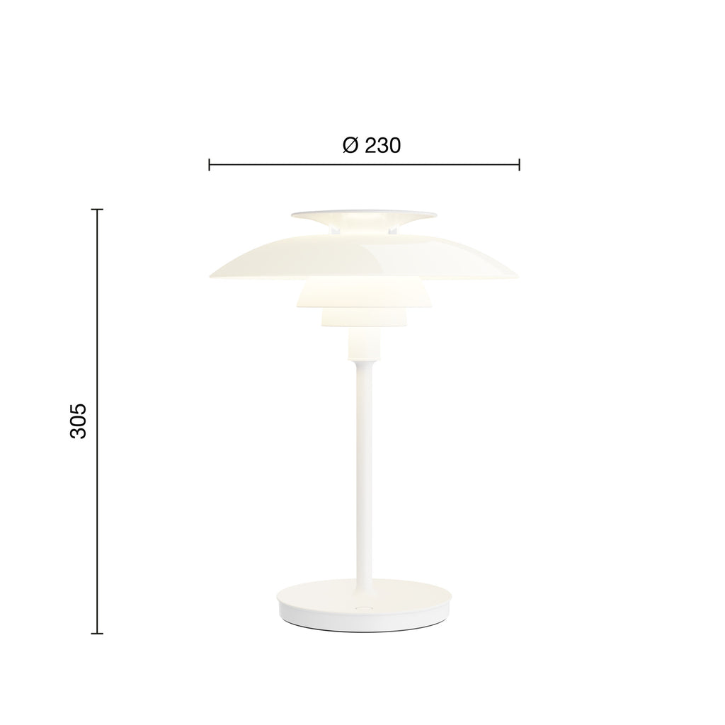 PH 80 Portable Lamp er opbygget af opale, hvide akrylskærme, der sikrer optimal lysfordeling og en behagelig atmosfære. Stammen fås i højglansforkromet eller hvid udgave og matcher PH-seriens velkendte formsprog. Lampen er udstyret med et genopladeligt batteri, LED-lyskilde på 4W (1800–3000K), og byder på både trinløs og trinvis dæmpning. Oplades på ca. 5 timer og lyser op til 32 timer på én opladning alt efter lysstyrkeniveau.
