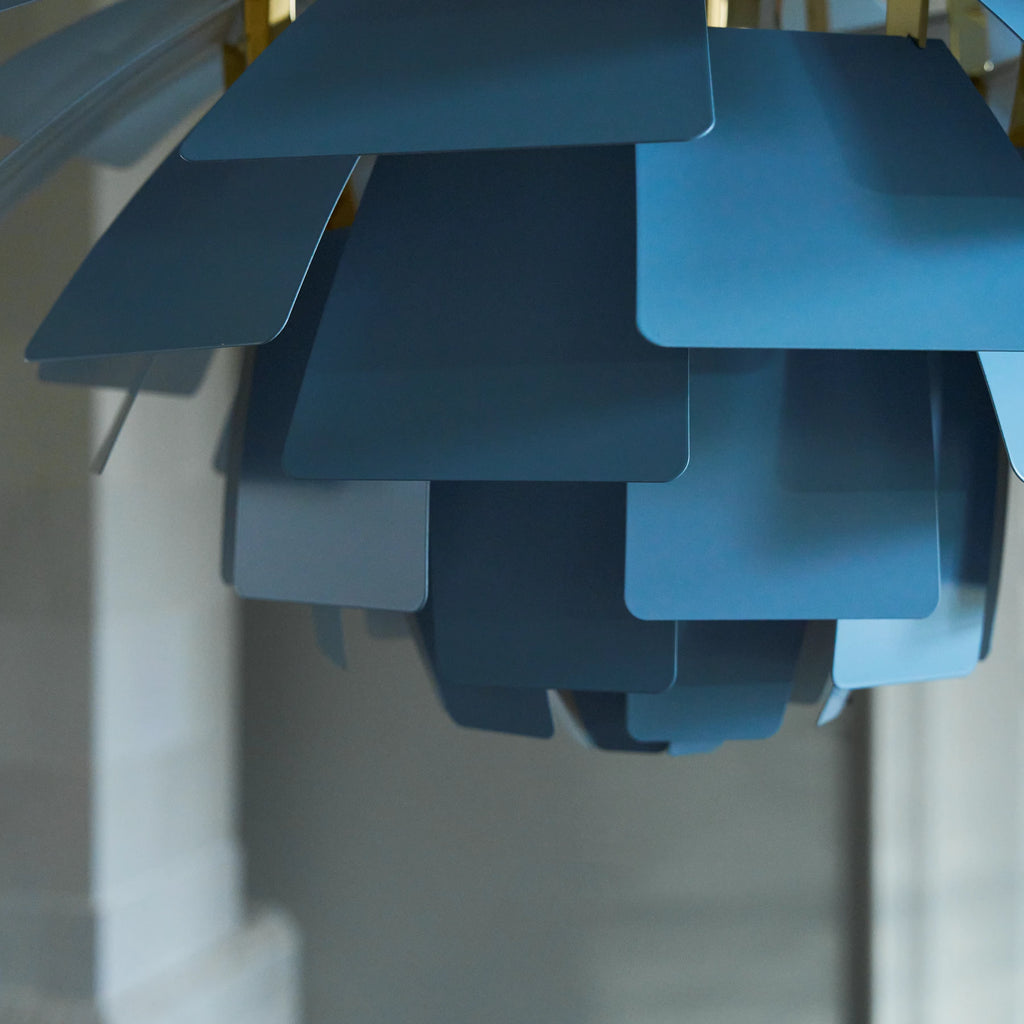 PH Artichoke bringer et usædvanligt blødt og stemningsfuldt lys ind i rummet. Den ikoniske skærm, bestående af overlappende blade, spreder lyset uden at blænde og sikrer en behagelig belysning fra alle vinkler. Den særlige kombination af dusty blue og metalliseret messing giver lampen et elegant og moderne udtryk, samtidig med at det varme lys får lov at spille frit imellem de smukke blade.