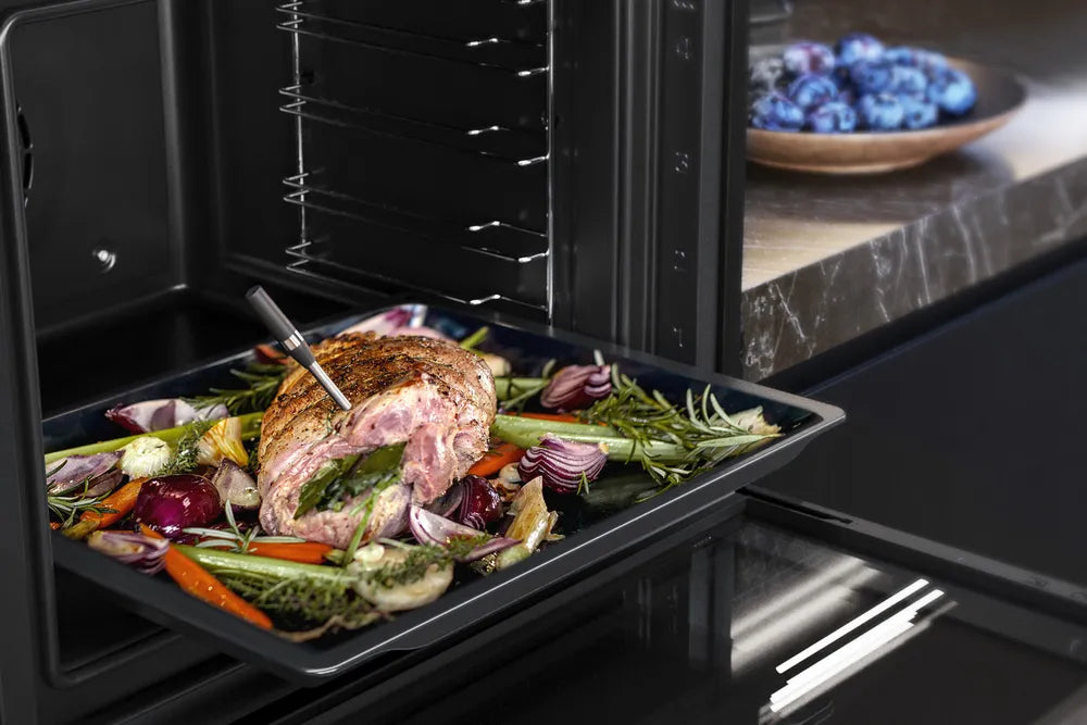 Termometerets sensorer måler nøjagtigt temperaturen inde i kødet eller fisken, hvilket sikrer, at madlavningen bliver præcis og pålideligt. Materialet af rustfrit stål bidrager til nem rengøring og lang levetid, mens enheden er kompatibel med ovnvogne, hvilket øger brugervenligheden og anvendelsesmulighederne.