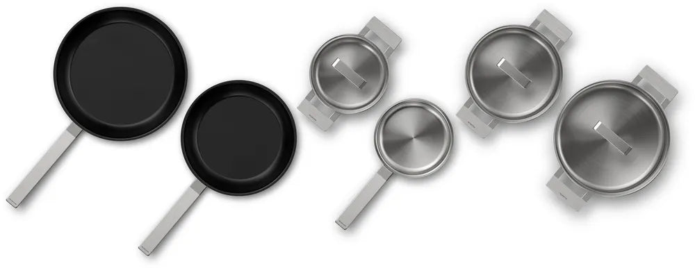 Inkluderer fire gryder og to stegepander i forskellige størrelser for alsidig brug
