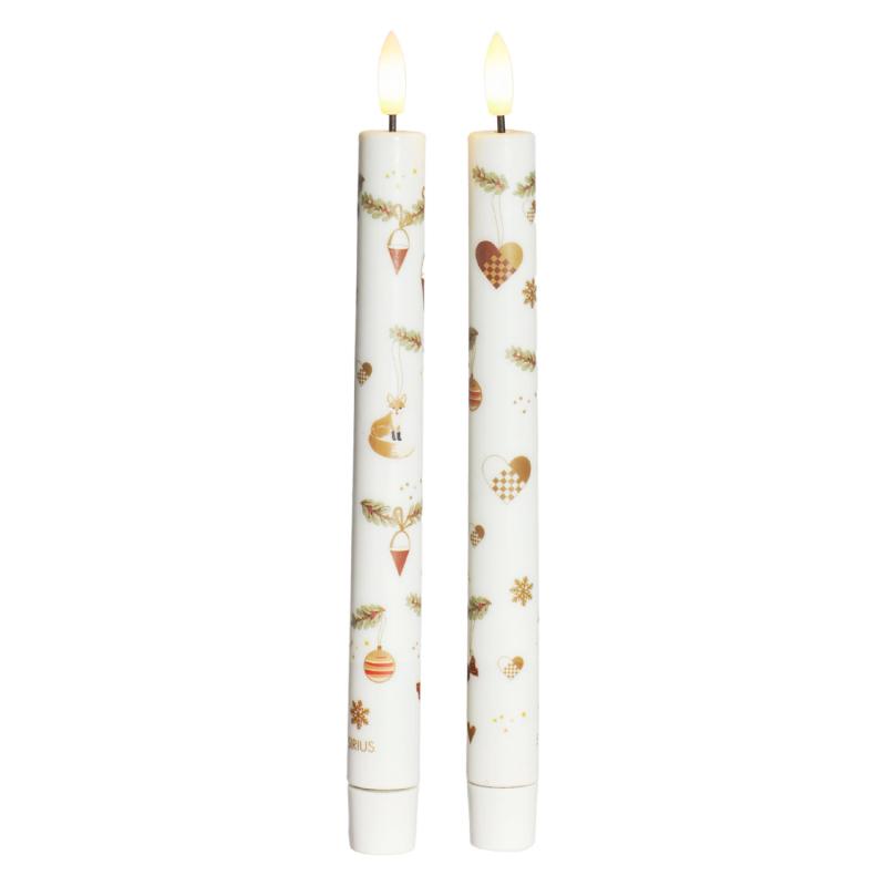 Mie Kronelys 2-pak, 25 cm i hvid, skaber en varm og festlig stemning med smukke julemotiver som hjerter, snefnug og julekugler. Disse klassiske kronelys er perfekte til at sætte en hyggelig og dekorativ tone i hjemmet omkring juletid. Med deres tidløse design og stilrene hvide farve passer de til enhver juledekoration og skaber et indbydende lys, som spreder juleglæde og hygge.