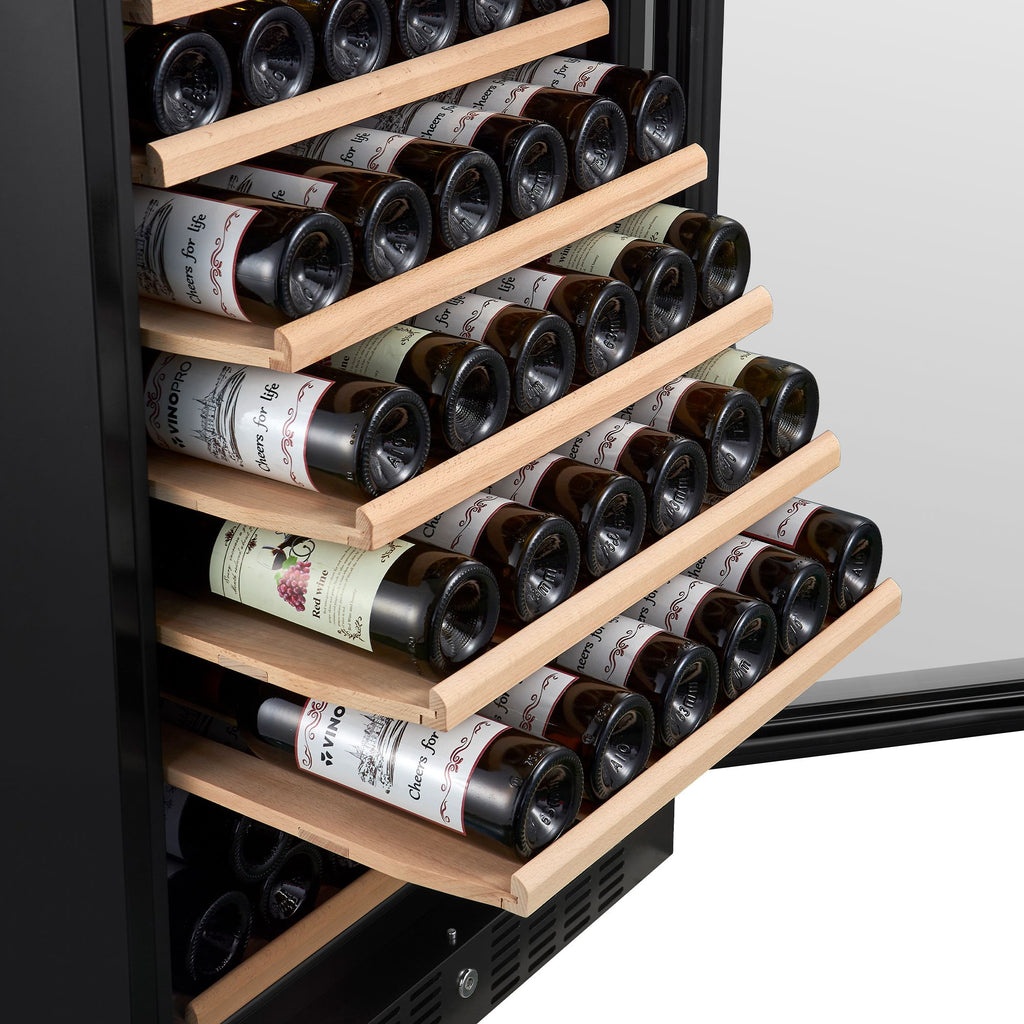 Skabet er fremstillet med kvalitetsmaterialer og avanceret teknologi, især med fokus på temperaturkontrol og fugtighed. De udtrækkelige bøgehylder er ikke blot robuste, men også æstetisk tiltalende, hvilket sikrer en elegant præsentation af vinene. Teknologien sikrer samtidig en stabil og jævn temperatur, hvilket er essentielt for vinens holdbarhed og smagsudvikling.